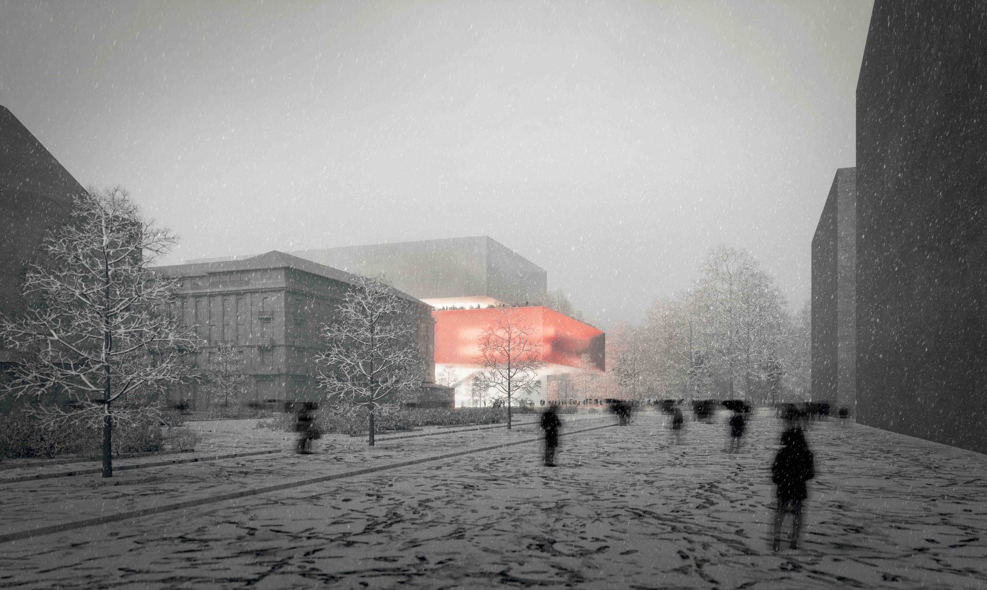Wie ein Kunstwerk erscheint der Entwurf; unten ein gläserner Sockel, darüber ein Geschoss in leuchtendem Rot. Im Interview erfährt Alethea Mag konkrete Details. Der transparente Sockel soll ein Platz für die Stadtbevölkerung werden, eine Stätte der kulturellen Begegnung, aber auch ein Ort, an dem man auch mal mit dem Skateboard durchfahren kann, so wünschen es sich die Architekten.