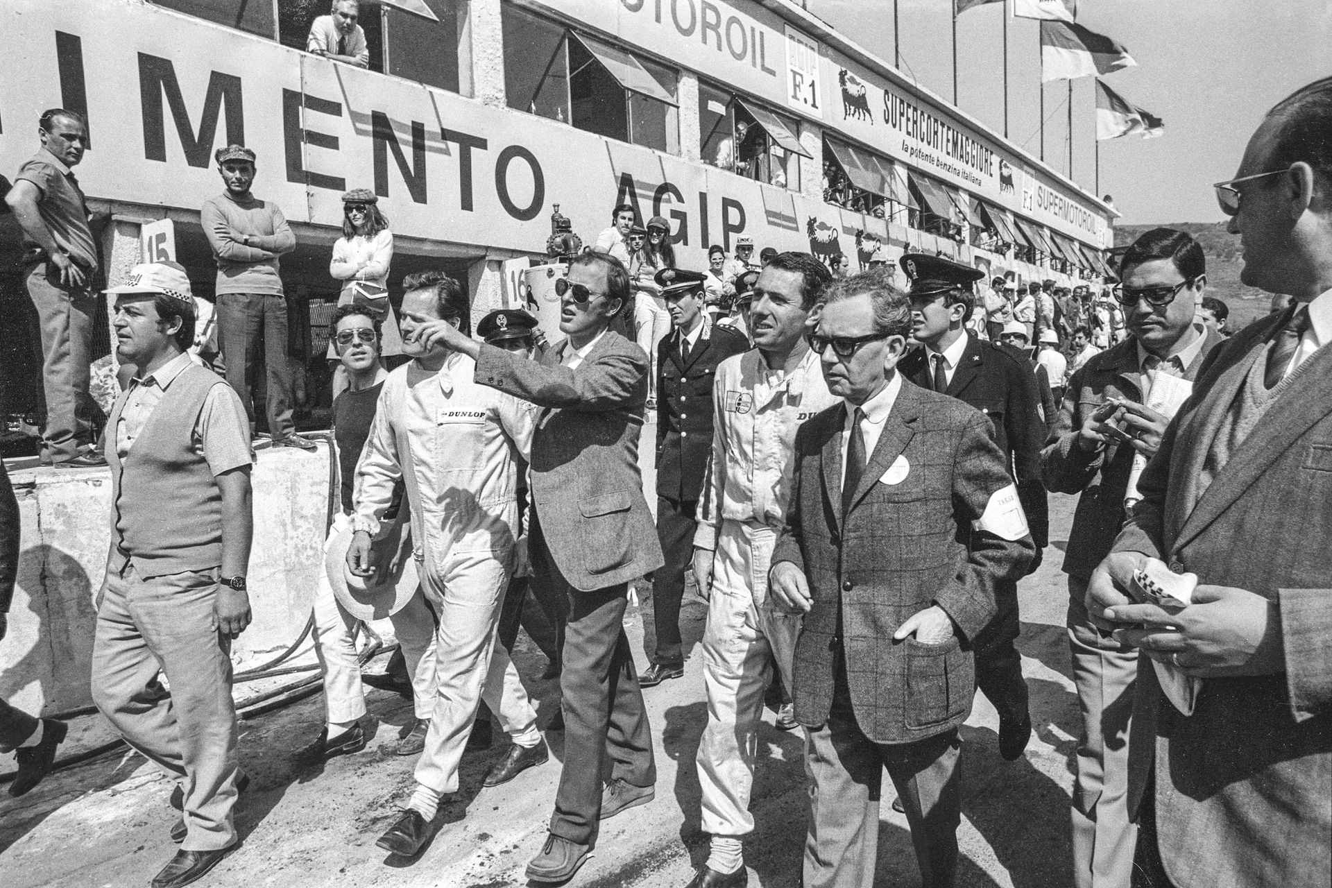 Ferry Porsche and Rico Steinemann, Porsche chief of competition, walk through the pit lane with their victorious drivers Gerhard Mitter and Udo Schütz. H Targa Florio, Sicily, 1969