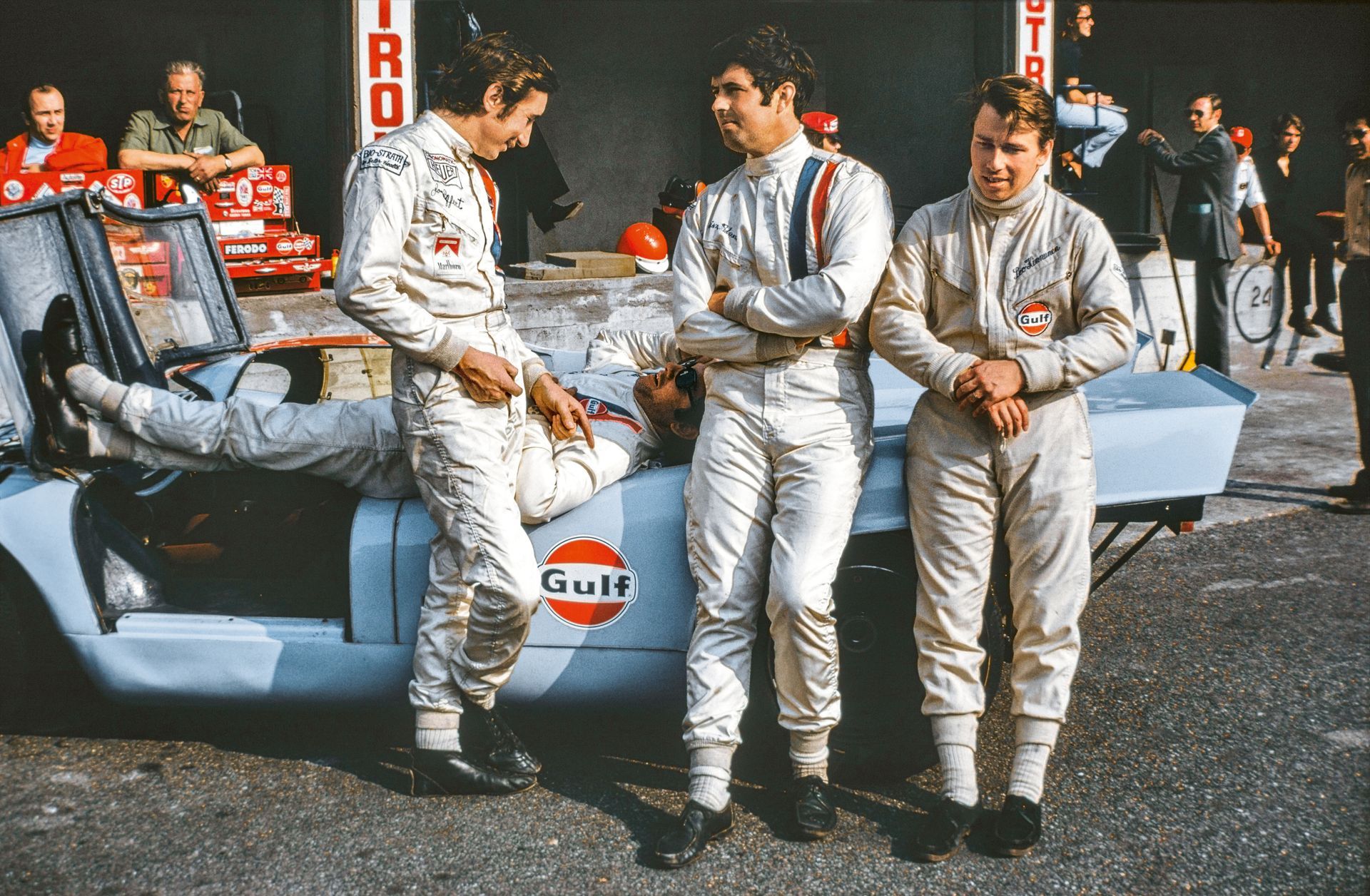The drivers of the John Wyer team: Jo Siffert, Pedro Rodríguez (horizontal), Brian Redman, and Leo Kinnunen. 1000 km Monza, 1970 N