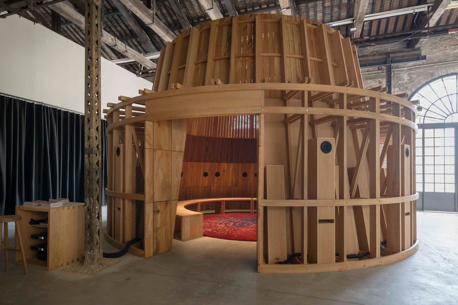 The Assembly installation, showcased in Venice, is a circular, modular space crafted from Irish beechwood, processed by Meredith from storm-felled trees, complemented by a handwoven carpet from Ceadogán Rugmakers. A sound composition by Stalling and Delea incorporates Delea’s poem “Assembly,” which poetically reflects the creative process. “The poem is the heart of the installation, honoring Ireland’s tradition of the spoken word,” Cotter said in an interview with Alethea Talks.