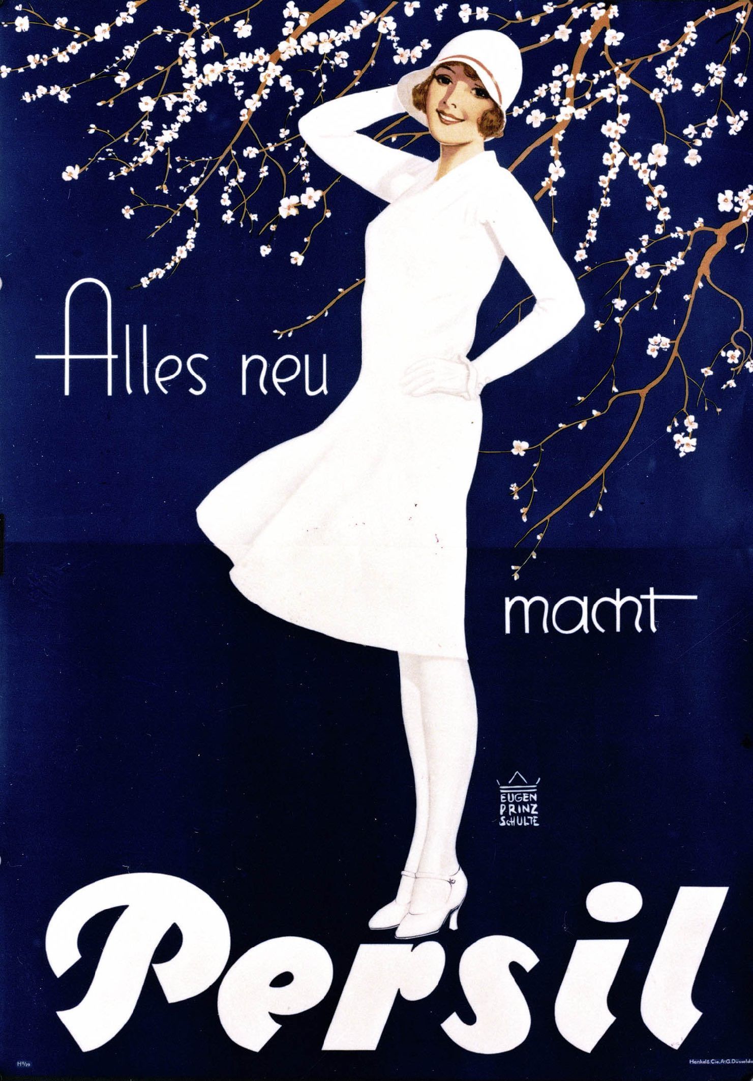 In 1922, the caricaturist and painter Kurt Heiligenstaedt was commissioned to design an advertising poster for Persil and modelled the lady on his friend Erna Muchow. He took her to the "KaDeWe" department store on Berlin's Alexanderplatz and bought her a white dress. With a Florentine hat on her head and a packet of Persil in her hand, the 18-year-old posed for the painter: this became the „Weiße Dame“ from the end of 1922.