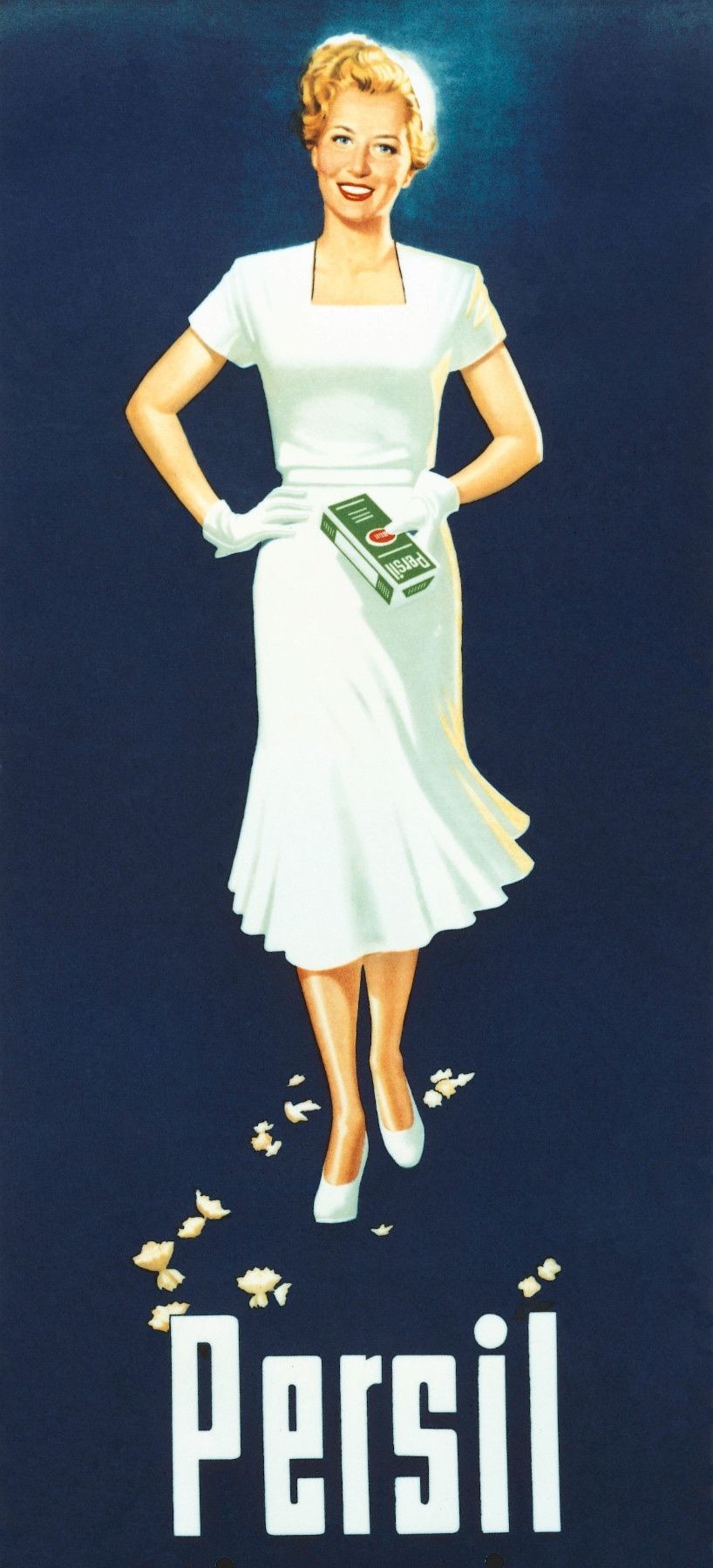 Over the decades, the „Weiße Dame“ has always been visually adapted to the spirit of the times and fashion tastes. Sometimes she was blond, sometimes brunette, sometimes dressed summery and sometimes wintery, but her white clothes always made her recognisable as a Persil advertising figure. Since the „Weiße Dame“ also advertised abroad and was visually modified many times, no exact number is documented. There are about 35 images of the „Weiße Dame“ in her original form - i.e. in an elegant white dress. If one adds similar representations in advertisements and unpublished designs, there are more than 50 motifs. In the past, the „Weiße Dame“ was repeatedly used on special occasions, for example as a historical motif on the Persil drums in 2001.