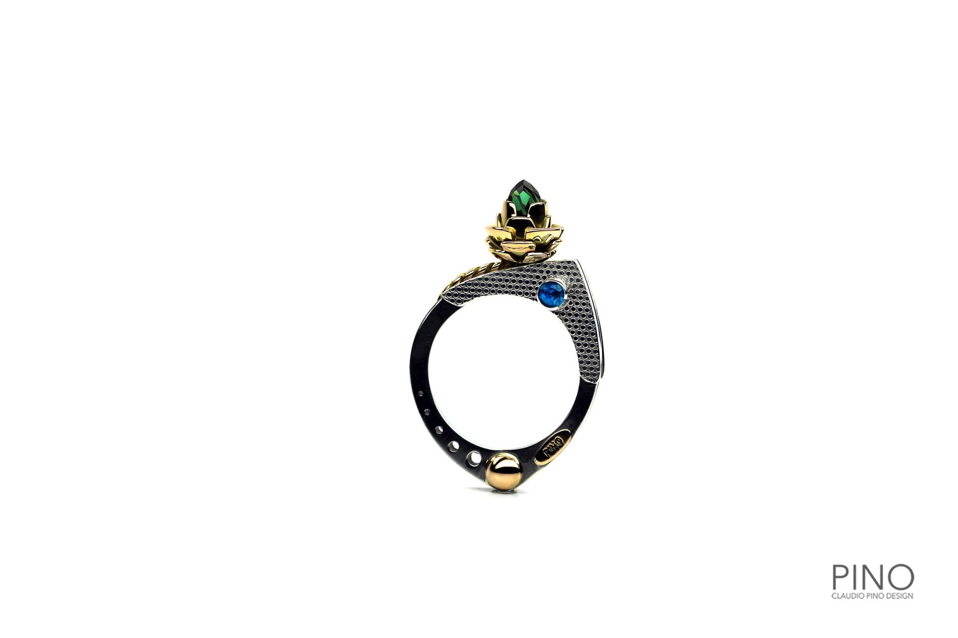 His ring are called futuristic. The world of Jules Verne, and his writings were definitely a major part of the Pino’s souvenirs from his childhood. Films like Around the World in 80 Days (1956) as depicted by Michael Anderson are still a source of inspiration to him. However, it is the mysterious worlds created by Japanese film director Hayao Miyazaki that brought him into the Steampunk movement in the early 90s. Animated films, such as Nausicaä of the Valley of the Wind (1984) and Laputa ~Castle in the Sky~ (1986), are definitely what rooted him in the scene. He creates his rings himself in his studio. There he also cuts the stones to fit his complex creations. Every ring creation begins for him with the inspiration of the right gemstone.