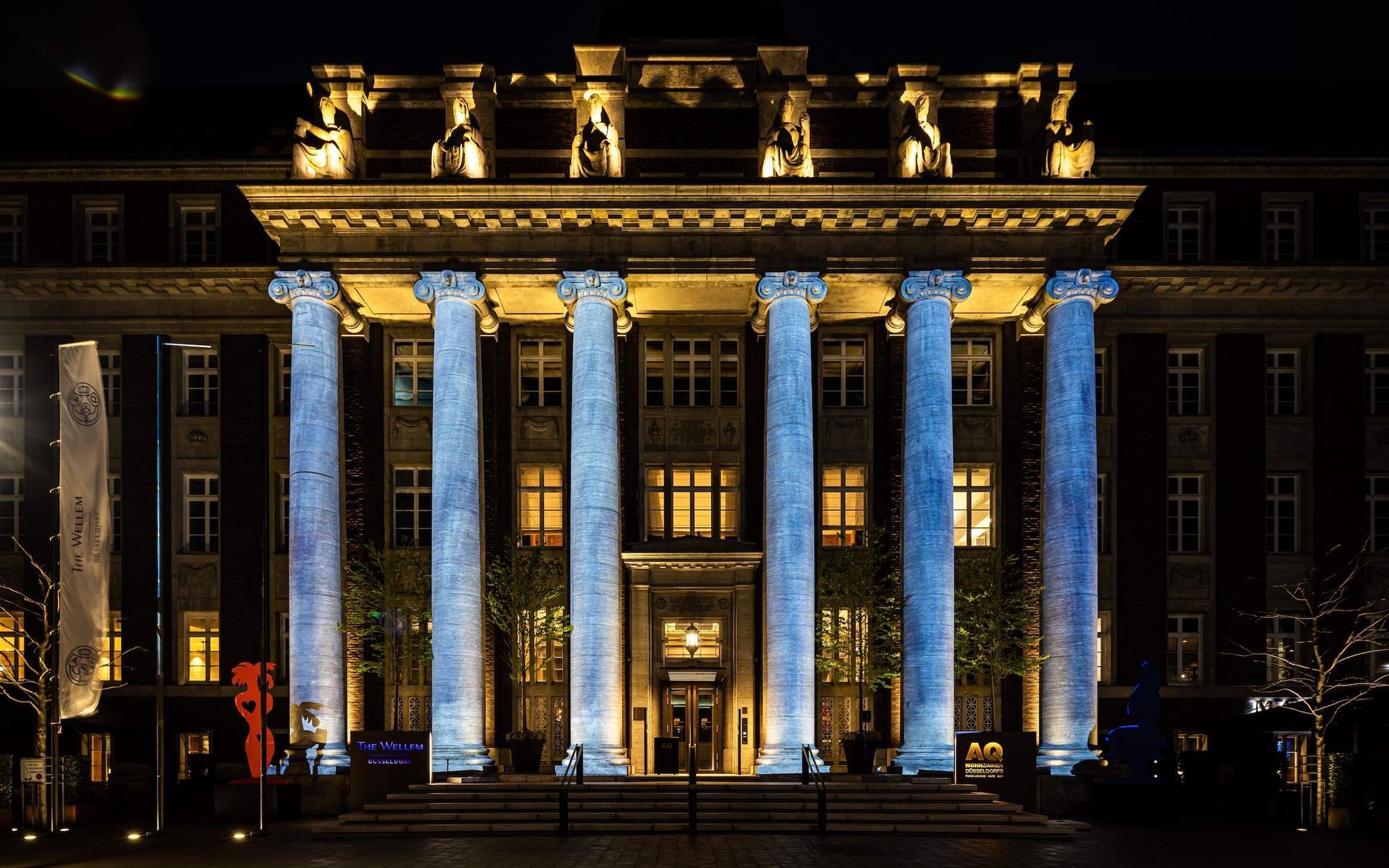 A waterfall by artist Stephan Kaluza that illuminated Düsseldorf's Designhotel The Wellem/Hyatt on the night of 8 and 9 April 2022. Two years earlier, he had installed a 100-metre-long and 2.30-metre-high Rhine photo collage there.