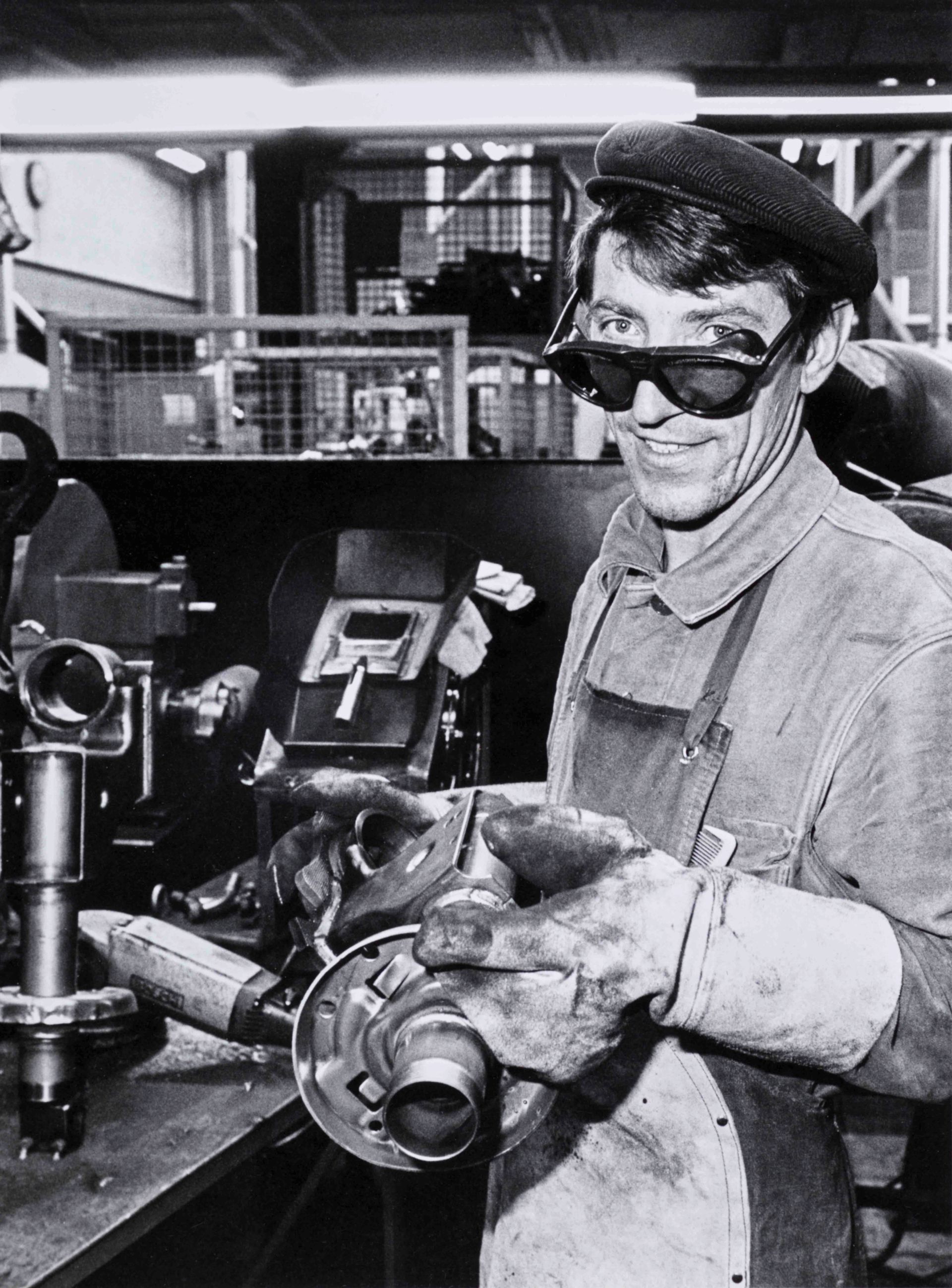 Ein Abzug zeigt einen sogenannten Gastarbeiter, vermutlich in der Automobilindustrie, an einer Maschine. Diese Bilder beziehen sich auf die Arbeitsmigrant:innen, unter anderem aus der Türkei oder Italien, die ab den 1950er Jahren kamen. Das Programm endete in den 1970er Jahren, aber in den 1980er Jahren wurde Migration komplexer, da viele dauerhaft blieben, Familien nachholten und sich Xenophobie als Thema verstärkte. Darchinger zeigt in einem Bild einen lachenden Gastarbeiter, was ein positives Bild vermittelt, obwohl die Realität – harte, schlecht bezahlte Arbeit – oft schwieriger war. Das thematisiert er selbst in einer kritischen Notiz auf der Rückseite des Abzugs.