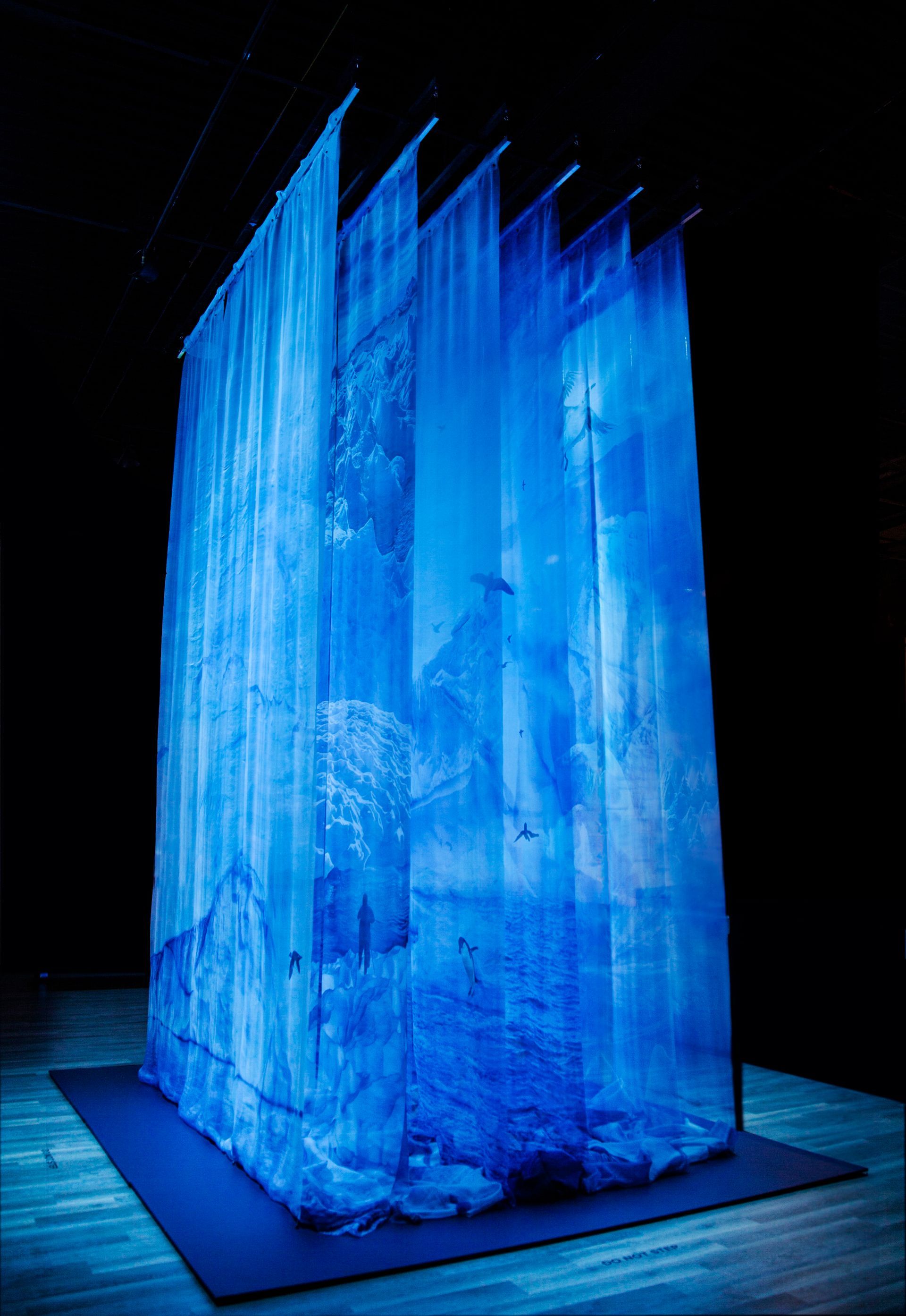 Your installation “Blue Tears”, in which glacier images on silk organza slowly glide to the ground, is very poetic. How can the aesthetic beauty of this work be balanced with the painful reality of glacier loss?