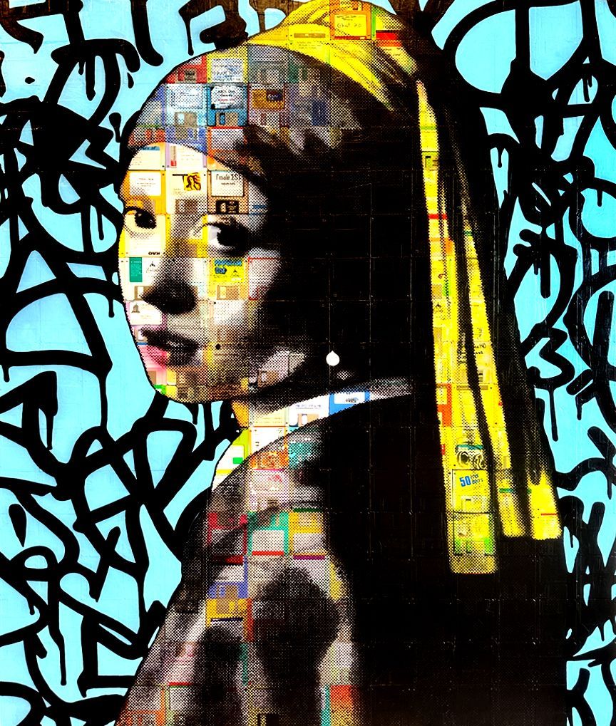 Girl With A Pearl Earring v2.0 Vermeer pop graffiti painting recycled computer floppy disks © Taylor Smith
