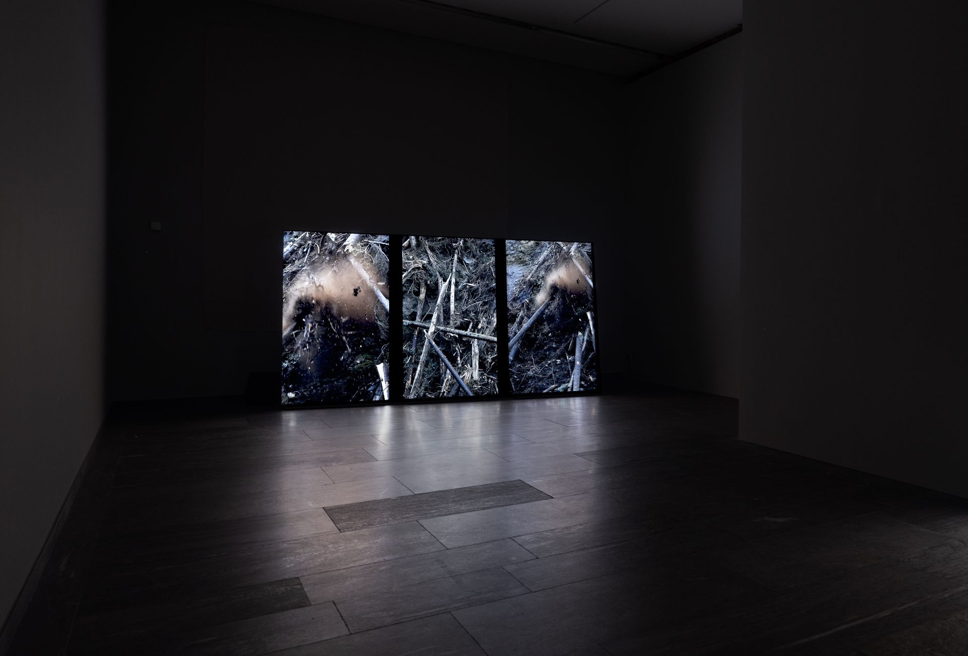 In meiner Ausstellung wird dies durch die Dreikanalige-Videoinstallation Cull erforscht, die diesen Prozess der Wiederherstellung nach der Zerstörung am Beispiel der Rodung der Haselbachschlucht verfolgt. Die Haselbachschlucht ist eine 150 tiefe Schlucht mit besonders steilen Hängen, so steil, dass die Bäume per Hubschrauber von den Seiten gerissen werden mussten. Zu Kosten aufwändig sie ebenfalls mit dem Hubschrauber abzutransportieren, wurden sie in die Schlucht gestürzt. Da sie nun ein Hochwasserrisiko darstellten, mussten sie einzeln aus der Schlucht rausgeseilt werden. Die Räumung erfolgt, indem ein einzelner Mann die Sisyphusarbeit übernimmt, einen Baum nach dem anderen über einen Zeitraum von zwei Monaten aus der Schlucht zu ziehen. Der extrem gefährliche Arbeitsprozess ist auch der Grund dafür, dass es immer schwieriger wird, Arbeitskräfte zu finden, die bereit sind, diese Arbeit zu übernehmen.